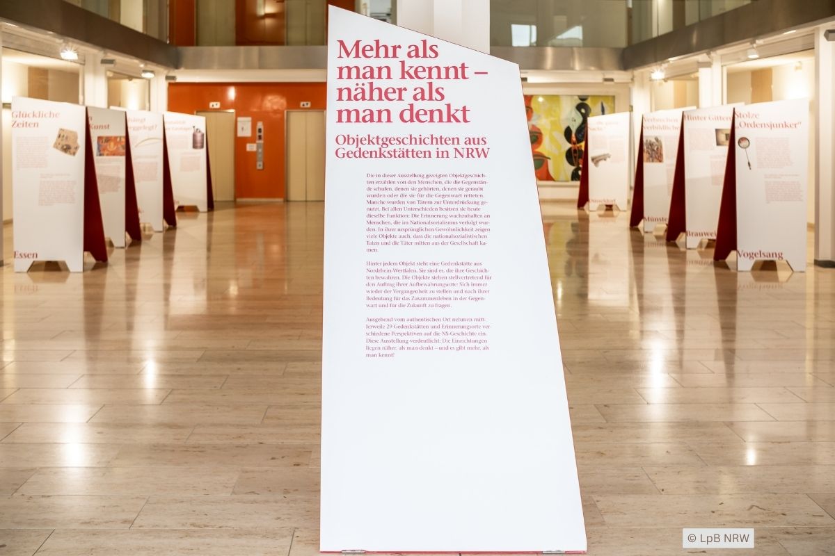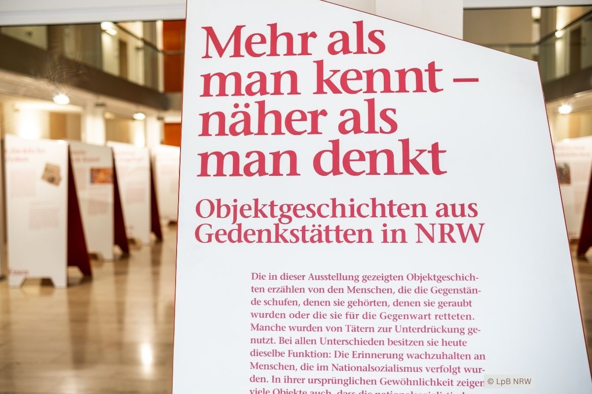 Das Bundesland Nordrhein-Westfalen verfügt über eine vielfältige und mit großem Engagement getragene Gedenkstättenlandschaft. Gemeinsam mit dem Arbeitskreis der NS-Gedenkstätten und -Erinnerungsorte in NRW hat die Landeszentrale für politische Bildung (LpB NRW) die Wanderausstellung zu NS-Gedenkstätten entwickelt, um diese Vielfältigkeit abzubilden. Die Wanderausstellung tourte durch alle Regierungsbezirke in NRW und war anschließend an weiteren besonderen Orten (u.a. Gedenkstätten, Museen oder Synagogen) zu sehen.